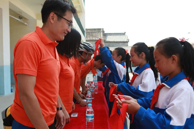 小學生們滿懷感恩地為尊龍凱時騎行隊的代表系紅領巾