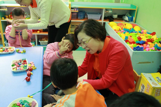 ▲基金會執行理事長劉景萍女士帶領孩子們做手工